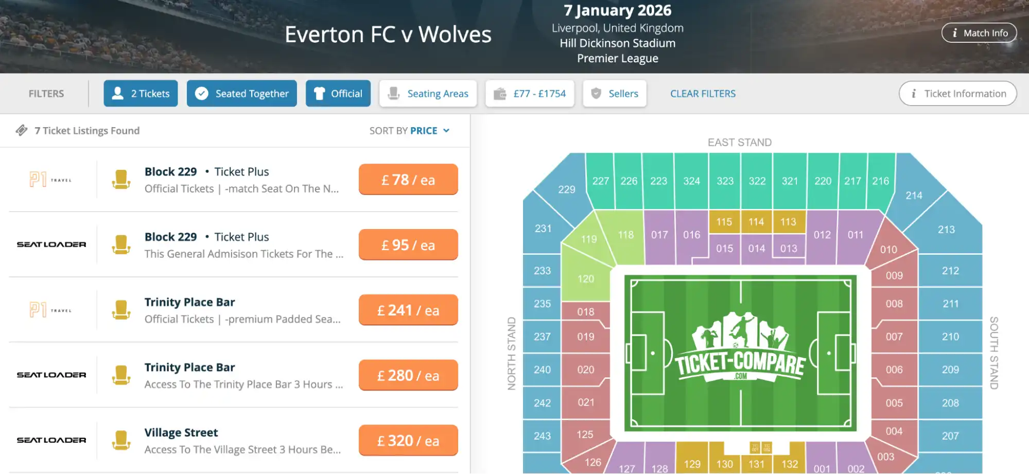 Vertailusivuston avulla löydät viralliset hospitality-liput eri yhteistyökumppaneiden pakkauksista kätevästi yhdestä paikasta. Everton tekee yhteistyötä useiden virallisten jälleenmyyjien kanssa, joista löydät hospitality-paketit myös viime hetken tarjouksina – joskus halvemmalla kuin suoraan seuralta.