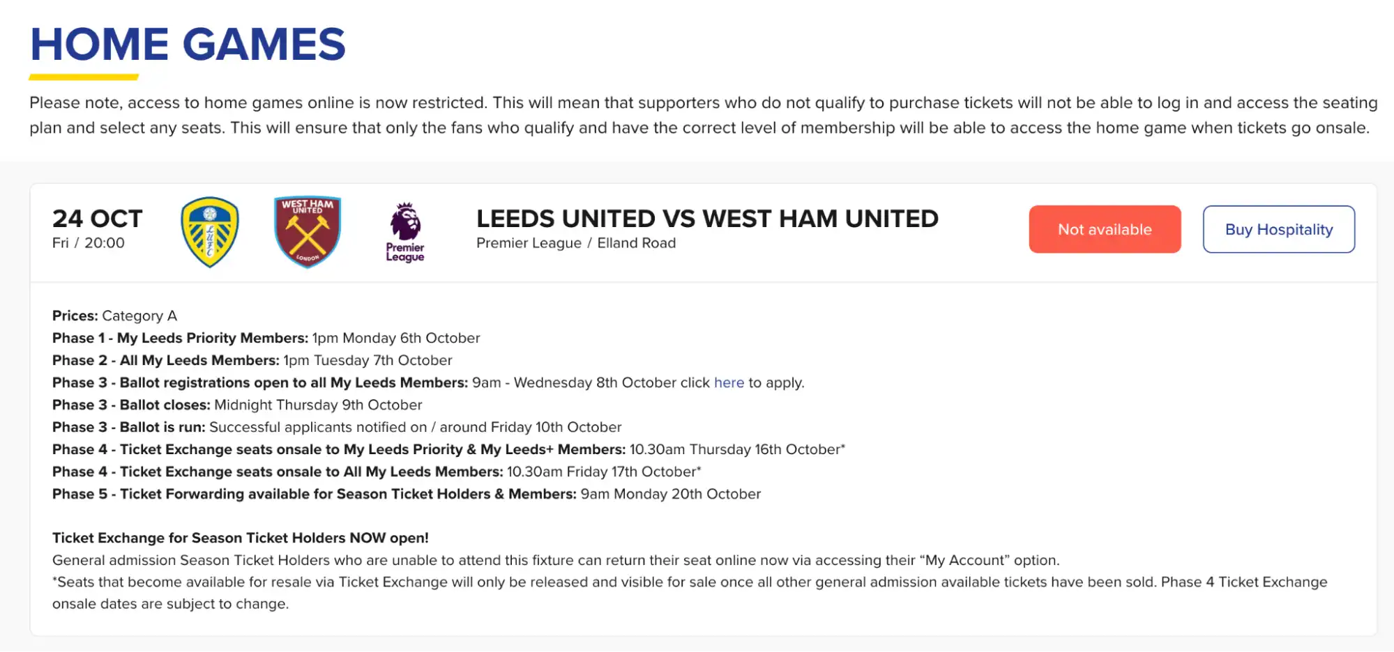 Ticket Exchange avautuu noin viikkoa ennen ottelua ja kausikorttilaiset palauttavat lippunsa sinne ajoissa. Tämän vuoksi My Leeds+ -jäsenen prioriteetti-ikkuna kannattaa hyödyntää.