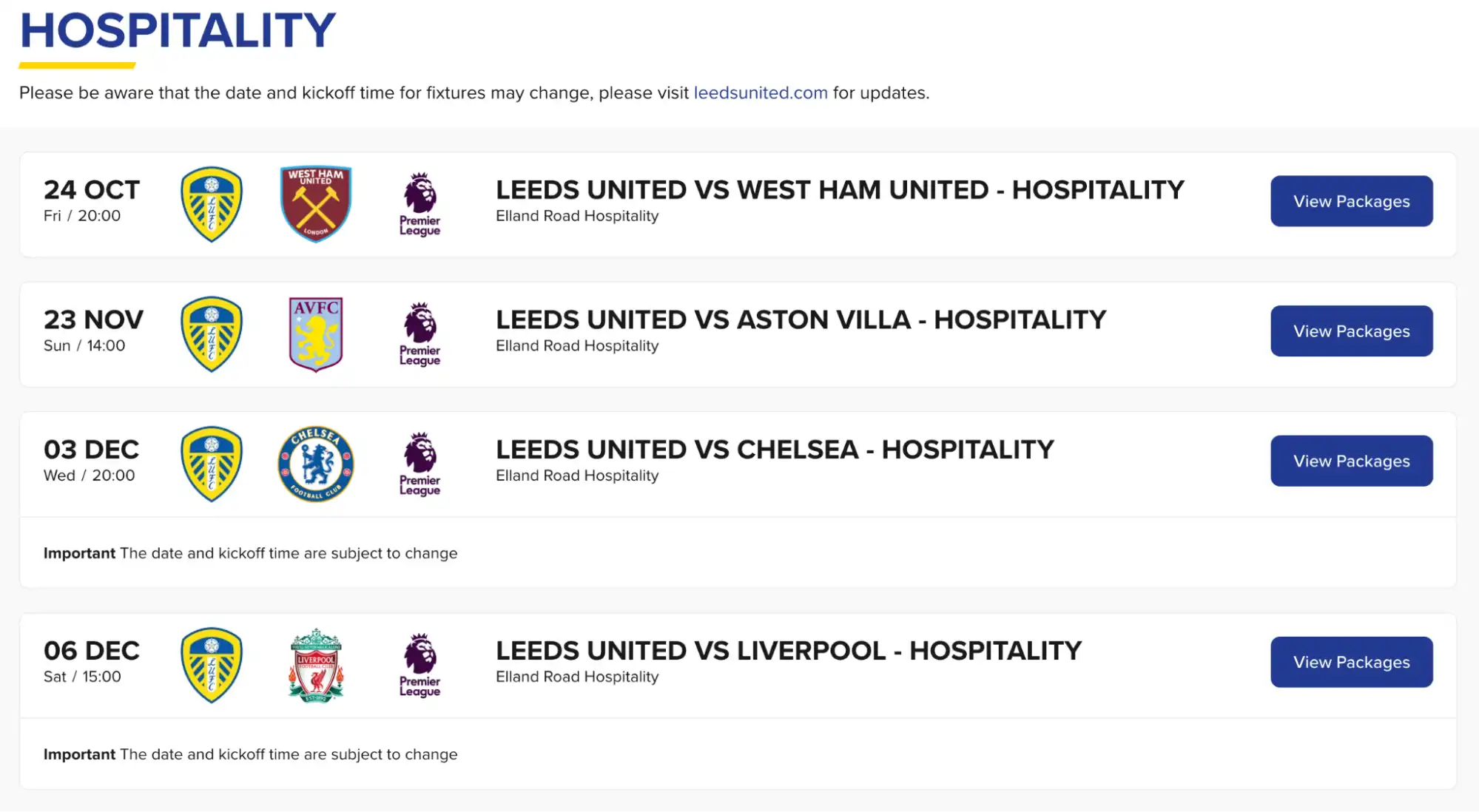 Näin ostat Leeds United hospitality -liput viralliselta sivulta