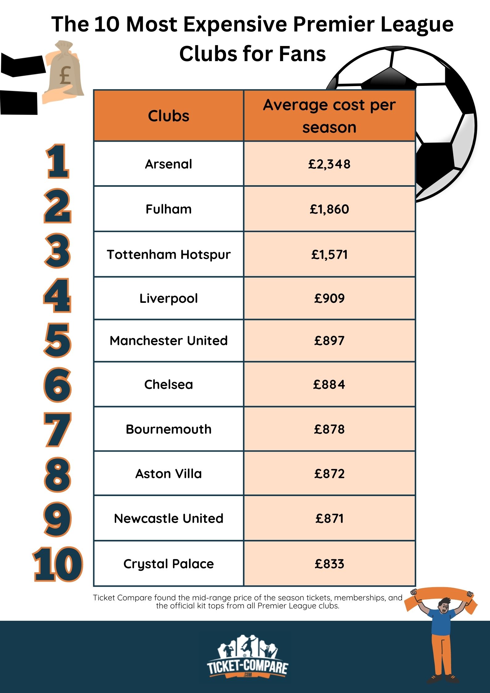 Arsenal on ylivoimainen ykkönen kuluissa! Yhteishinta $3,242 sisältää kaikkein kalleimman jäsenmaksun ($1,130). Arsenal virallinen paita maksaa noin $131.