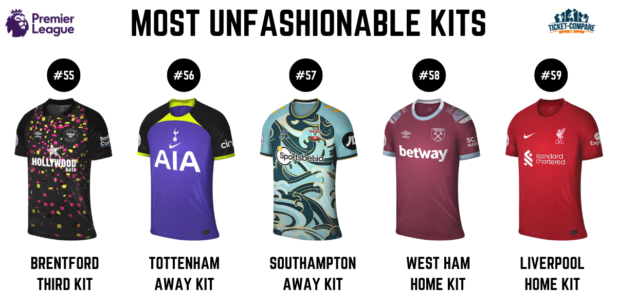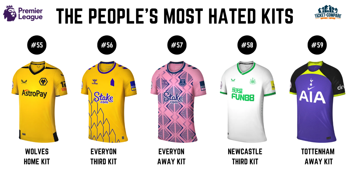 Keltainen ei fanien mieleen: Wolvesin kotipaita (2,7/5) ja Evertonin kolmas paita (2,6/5) löytyvät bottom vitosesta. Evertonilla on myös vieraspaita (2,5/5) pohjalla – ainoa joukkue kahdella paidalla häntäpäässä. Toisin kuin Unitedin valkoinen vieraspaita, Newcastlen kolmas valkopaita (2,4/5) ei saanut kannatusta. Tottenhamin vieraspaita (1,9/5) on arvosteltu kauden vihatuimmaksi.
